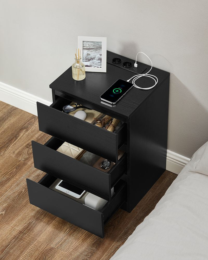 Veel opbergruimte: of je nu je bedlectuur wilt opbergen of je bril binnen handbereik wilt bewaren, dit nachtkastje biedt je met zijn ruime tafelblad en 3 gemakkelijk te openen laden met afgeschuinde randen voldoende ruimte.